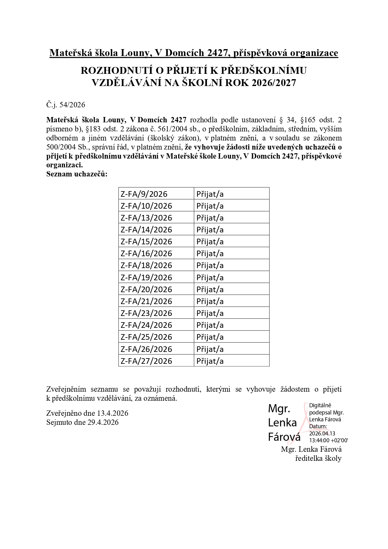 Seznam přijatých dětí pro školní rok 2026-2027